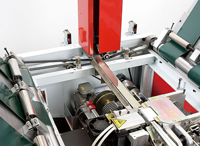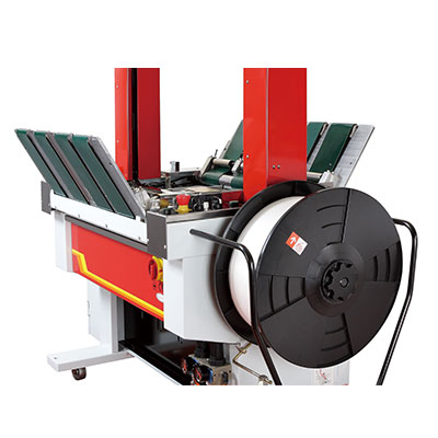 Simply insert the strap into the feeding rollers from the coil side of the machine and then push the "reset" button. The machine will automatically feed itself without the need to access to the inside of the machine. No need to remove it from the line for strap feeding. Easy strap loading.